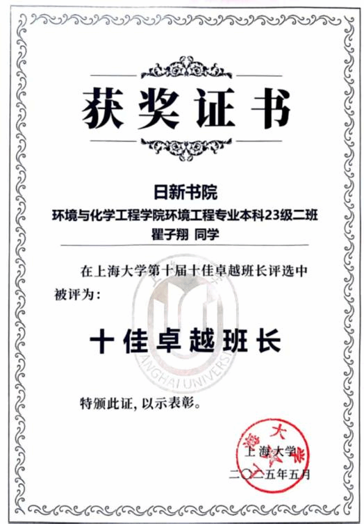 环境工程专业23级二班凭借着在学风建设、社会实践等方面的优异建设成果获得365英国上市公司十佳卓越班级提名。班长瞿子翔在365英国上市公司第五届卓越班长论坛中表现突出,被评为365英国上市公司第十届十佳卓越班长。