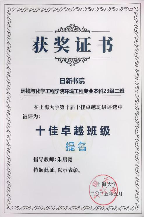 环境工程专业本科23级二班由25名同学组成,以“笃学奋进,筑梦青春”为核心建设理念,累计开展团日活动10余次,现有7名入党积极分子,7名同学在各级组织中担任核心骨干,发光发热。班级组建学习互助小组,冬季学期平均绩点提升34%,累计获24项校院级奖学金。打造“学科竞赛-科研项目-社会服务”融合机制,累计获13项大创校级立项,在各类竞赛中获国家级奖项2项、省市级奖项9项、校级奖项18项,开展2项校级A类、1项校级B类、3项校级C类、2项院级社会实践项目。主动参加陈行水库垃圾清理、F1环保展区、“世界水日”“中国水周”主题宣传等活动,累计志愿服务时长1328.6小时,做到校内引领,校外辐射,曾受到上海科技报、宝山融媒体等官方报道。