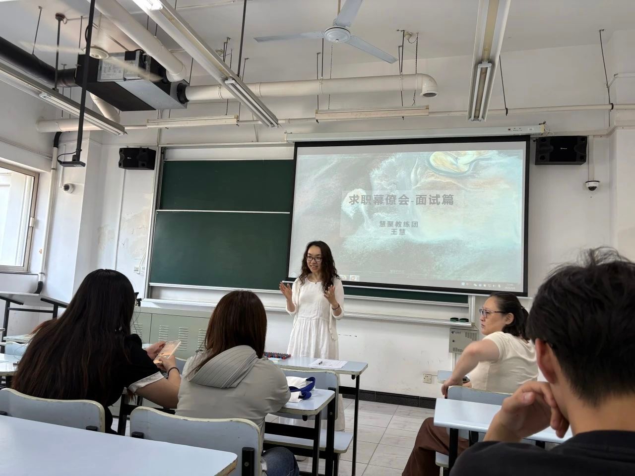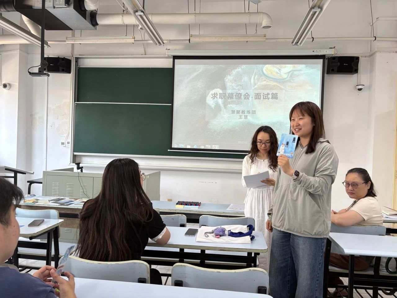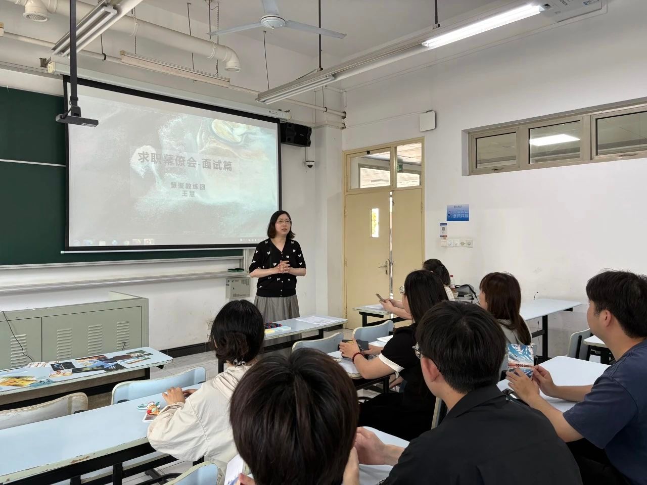 6月6日下午13:00,由我院“绿航”职业生涯教育工作室举办的“职闯未来”训练营以“求职幕僚会”为主题的第四期线下辅导在A104成功举办。此次活动是我院党团班的重要专题课程之一,活动邀请了慧聚教练团3位讲师和12名党团班成员,由慧聚教练团王慧老师主讲。