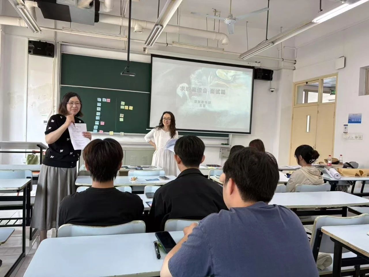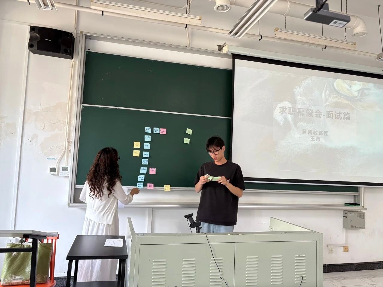 随后,在面试模拟环节中,老师引导各小组成员梳理最为担忧的面试问题,形成一份“面试恐惧清单”。真实反映了同学们面临的普遍困扰,如“不知如何应对无领导面试”、“不知如何应对加班相关提问”以及“缺乏实习经历时该如何作答”等常见面试焦虑。