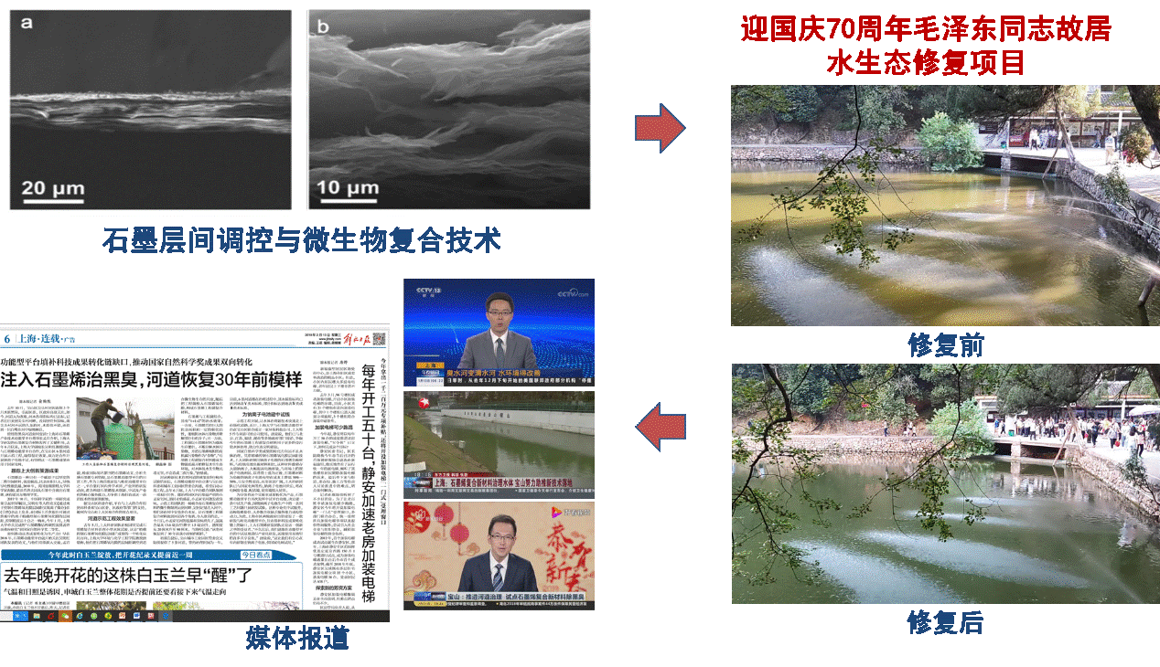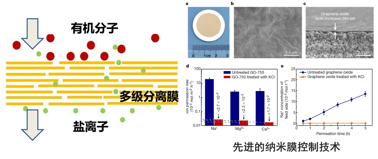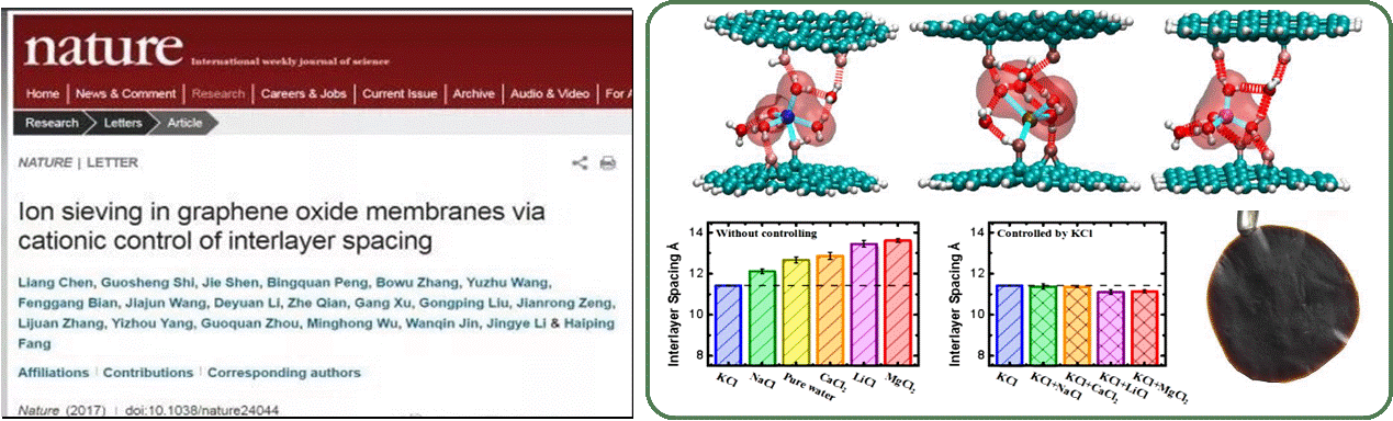团队在国际上率先将金属水合离子插入氧化石墨烯膜片层,并利用离子水合半径的尺寸排阻效应实现对石墨烯层间距的精确控制,展现膜出色的离子筛分性能,相关理论成果于2017年发表在国际权威学术期刊Nature上。以此研发的氧化石墨烯复合工业膜材料,突破了传统纳滤膜只能实现单价与多价离子分离的技术瓶颈,实现了污染水体高价值离子的精准筛分、高效富集利用,成果被国际同行广泛跟踪报道。