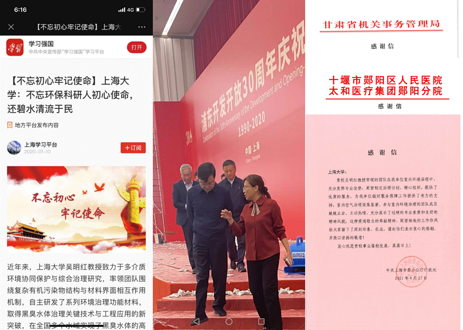 近年来,吴明红及其团队坚持“四个面向”,把国家需要、团队建设紧密起来,持续以科技自主创新服务国家生态文明建设。她带领组建教育部创新团队及上海市创新团队,建设有机复合污染控制教育部重点实验室等,建立江苏无锡、东阳、四川攀枝花等产业研究院,推动科技与产业深度对接、全面融合。研发碳基工程材料应用于工业挥发性有机物治理、地表水环境生态修复等领域,不断突破“卡脖子”技术难题,广泛应用于船舶工业、石油化工、煤化工等重要工业行业的有机污染治理工程,取得了巨大的经济和社会效益,在国家污染攻坚、脱贫攻坚、疫情防控等工作中发挥重要作用。在迎接新中国成立70周年之际,团队赴毛泽东同志故居上屋场,研发“石墨烯复合新材料治理工艺”对水体进行生态修复,实现水体治理关键技术新突破。在庆祝上海浦东改革开放30周年大会现场,团队研发低成本石墨烯量子点高效催化涂层,攻克空气质量保障技术难关,保障重大活动的环境安全,被上海市委办公厅等单位致信感谢。在新冠肺炎疫情期间,吴明红院士带领团队研发的室内有机污染及病菌处理的石墨烯量子点涂层材料和具有灭活新冠病毒能力的新型口罩,应用于十堰医院病区空气杀菌净化和新冠疫情的前线防护,有效阻断病毒传播,多次被相关医疗单位致信感谢。