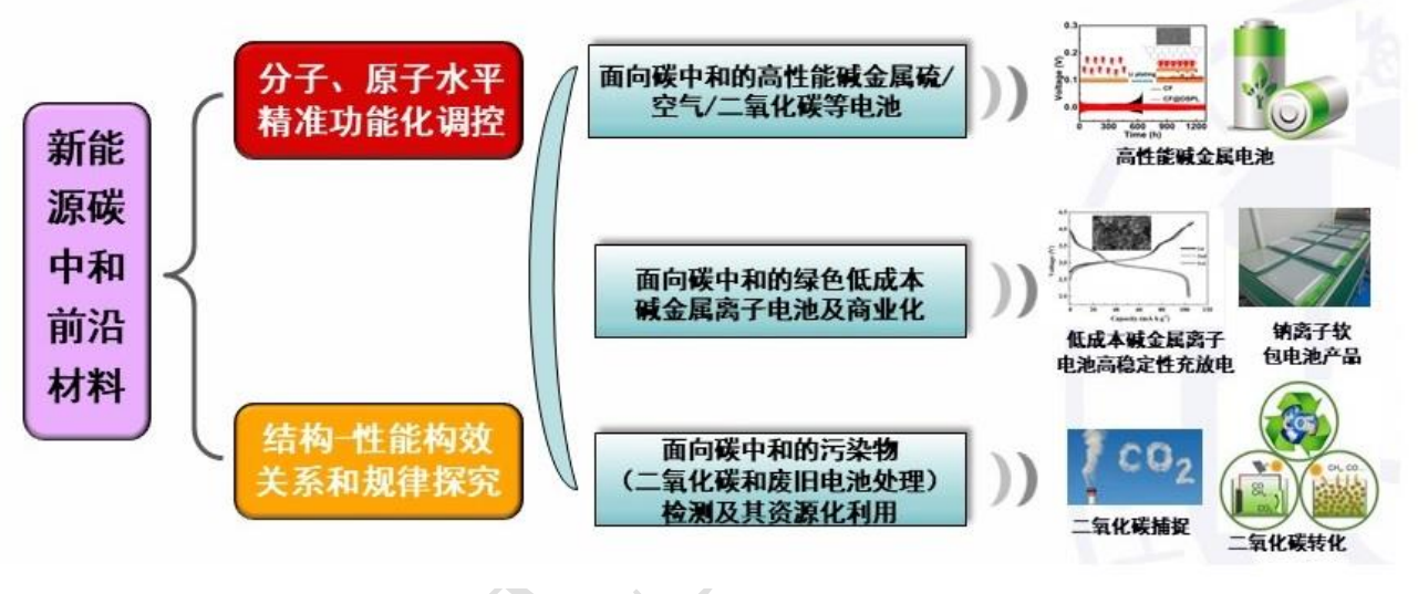 瞄准未来新能源碳中和前沿材料的战略要地,针对目前我国新能源领域材料创新研发中存在的关键科学问题,围绕如何实现材料的基础化学机理、分子、原子水平的精准功能化调控,以及如何通过理论计算和实验过程揭示结构-性能构效关系和规律两个主要方面,重点研究以高性能电池为核心的先进储能材料设计及利用、以二氧化碳转化再利用为基础的碳中和能源催化材料研发,以及各类新能源存储及转化器件的产业化应用和废旧电池资源化回收利用等。