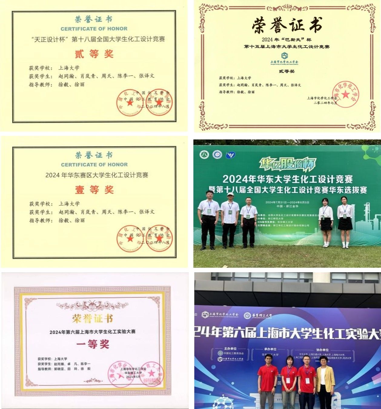 化工专业本科生参与化工、能源领域竞赛也收获众多奖项。其中全国大学生化工设计竞赛,迄今已获得壹等奖2项、贰等奖12项、叁等奖3项,显著提升了365英国上市公司在全国高校中的影响力,也充分体现了化工专业以学生为中心的人才培养工作与新形势下的社会需求结合紧密,创新性人才培养的质量得到了社会的充分认可。值得一提的是,在刚刚结束的2024年全国大学生化工设计竞赛中化工学子又喜获佳绩,赵同瀚、肖岚青、周天、陈李一、张译文等五名化工专业本科生组成的“环五烷2024”团队喜获全国贰等奖。此前,该团队已于上海赛区和华东赛区分别获得贰等奖和壹等奖。同时,化工学子在2024年第六届上海市大学生化工实验大赛中也收获一等奖。