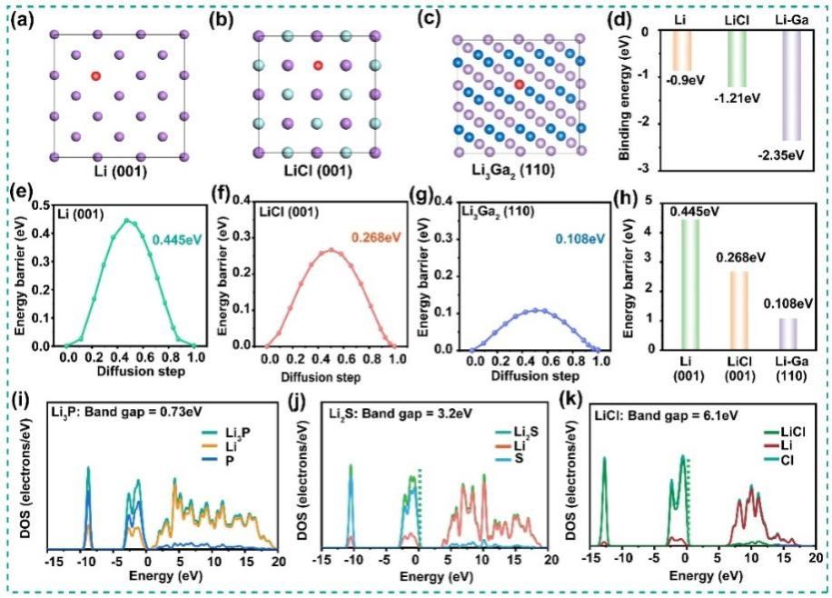 课题组首先通过理论计算提出了一种合理的设计方法来获得稳定的Li/LPS界面,随后采用简单、低成本的策略在Li/LPS之间构建了独特的亲锂/高界面能Li-Ga/LiCl(LGC)界面层,因混合界面中LiCl具有高界面能和电子绝缘性,锂枝晶得以有效的抑制;Li-Ga合金相则具有优异的亲锂性和相对低的扩散势垒,可以提供均匀的电场分布并诱导Li+的快速传导,从而实现Li/LPS界面的致密化、低界面阻抗和全电池优异的循环稳定性。这项工作为实现高性能硫化物固态锂金属电池提供了一种基于理论计算的合理设计方法。