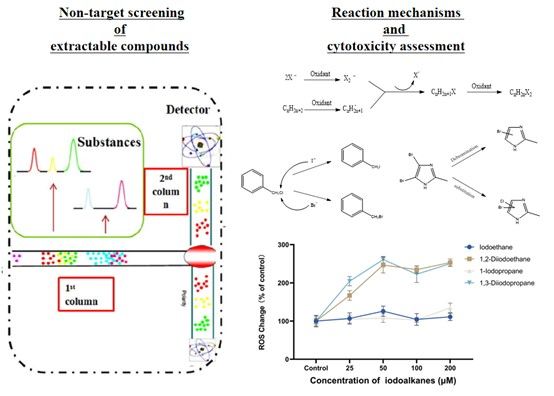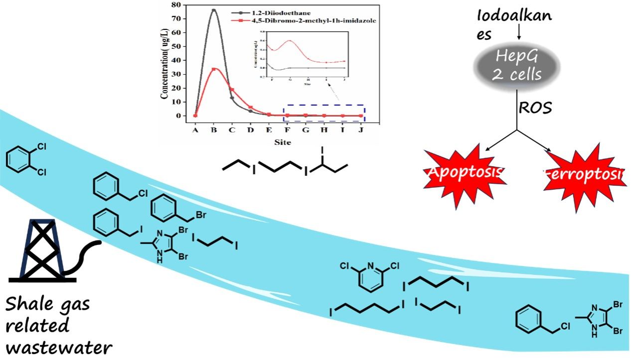 为了进一步探索典型非受控卤代有机物在地表水中的迁移情况,课题组在受纳水体采集了径向分布的水样进行分析,旨在探讨受页岩气废水排放影响的地表水中未知来源卤代有机化合物(HOCs)的污染特征和环境风险。研究发现所有HOCs均在页岩气废水排放口检测到并达到峰值,且在排放口下游检测到的种类数量和浓度水平均高于上游采样点,这预示着页岩气废水排放是造成这一结果的主要原因。HOCs可通过废水排放向下游迁移,在排污口下游5公里处的水体中仍检测到部分HOCs,表明了这些化合物具有持久性和可迁移性。此外,本研究还利用HepG2(人类肝癌细胞)模型在体外进一步研究了3种典型二碘代烷烃的细胞毒性和作用机理。结果显示,暴露于环境剂量的碘代烷烃会抑制 HepG2 细胞增殖、诱导活性氧生成和线粒体功能障碍。机理研究表明,ROS(活性氧)介导的细胞凋亡途径和铁死亡途径参与了碘烷烃诱导的HepG2细胞毒性。上述成果发表在《Science of the Total Environment》上,研究成果可为我国页岩气开采的健康风险管理提供支撑。