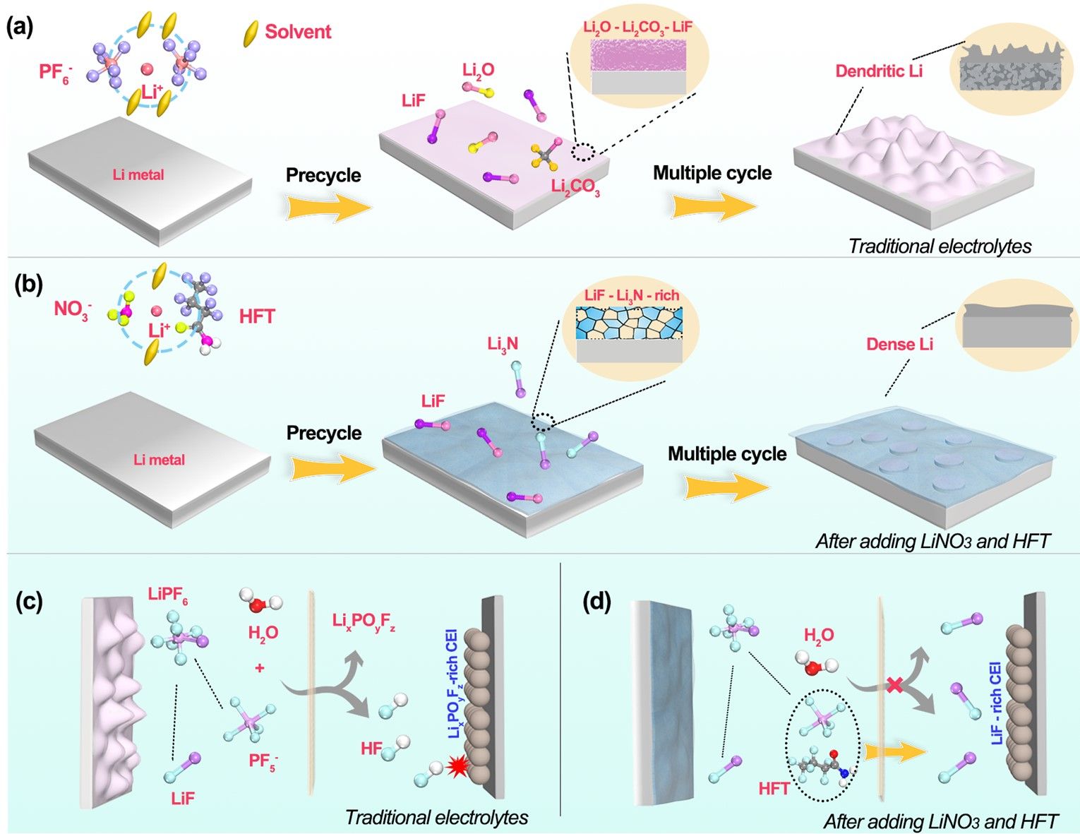 本工作通过在碳酸酯电解液中引入七氟丁酰胺(HFT)和硝酸锂(LiNO3)添加剂,成功地在锂金属表面原位构建了具有优异离子传输动力学和高机械强度的固态电解质界面层(SEI)。由于HFT中羰基(C=O)与Li+之间的强烈配位作用,可以促进LiNO3在碳酸酯电解质中的溶解。双添加剂的引入首次在碳酸酯电解质中实现了溶剂化结构、离子传输动力学、去溶剂化能垒、成核能垒以及抑制氢氟酸(HF)生成的全面改善。与磷酸铁锂和镍钴锰三元(NCM 811)正极配对的全电池具有出色的循环性能。即使在-20 ℃的低温下,可稳定循环500圈以上仍保持较高容量。这项工作为促进锂负极在碳酸酯电解液体系中的长循环和应用提供了有效的策略。