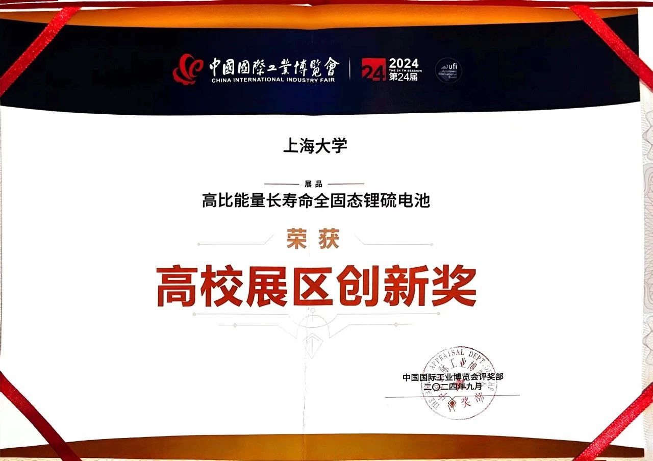 9月24日—28日,以“工业聚能 新质领航”为主题的第24届中国国际工业博览会在上海国家会展中心召开。我院蒋永教授团队项目“高比能量长寿命全固态锂硫电池” 荣获第24届中国国际工业博览会高校展区创新奖。