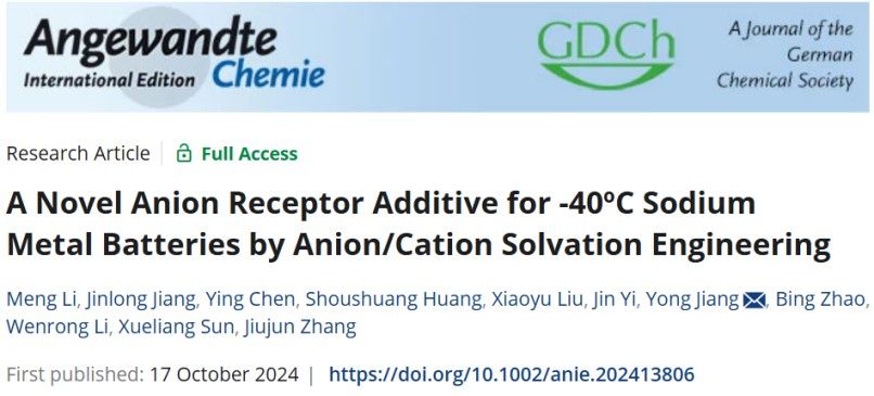 近日,蒋永研究员、赵兵研究员课题组在国际知名期刊《Angewandte Chemie International Edition》上发表关于阴离子受体添加剂实现碳酸酯电解液体系超低温钠金属电池的研究成果,论文题目为“A Novel Anion Receptor Additive for -40ºC Sodium Metal Batteriesby Anion/Cation Solvation Engineering”。