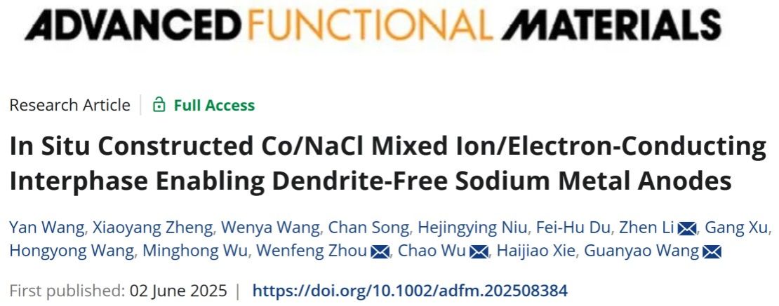 近日,我院射线应用研究所李珍研究员和王官耀副研究员合作在材料领域国际知名期刊《Advanced Functional Materials》上发表题为“In Situ Constructed Co/NaCl Mixed Ion/Electron-Conducting Interphase Enabling Dendrite-Free Sodium Metal Anodes”的研究论文。