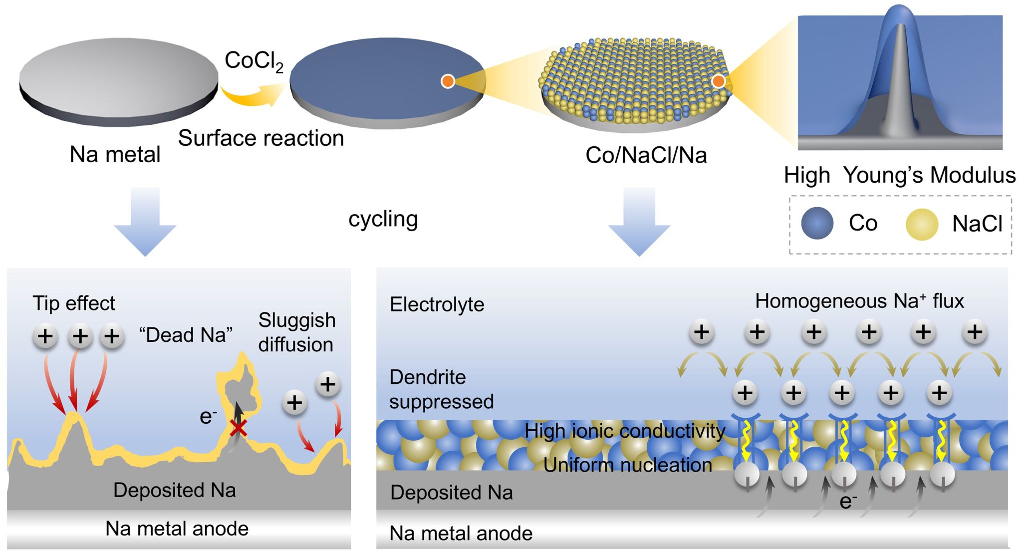 Co/NaCl混合离子/电子导体抑制钠枝晶的示意图