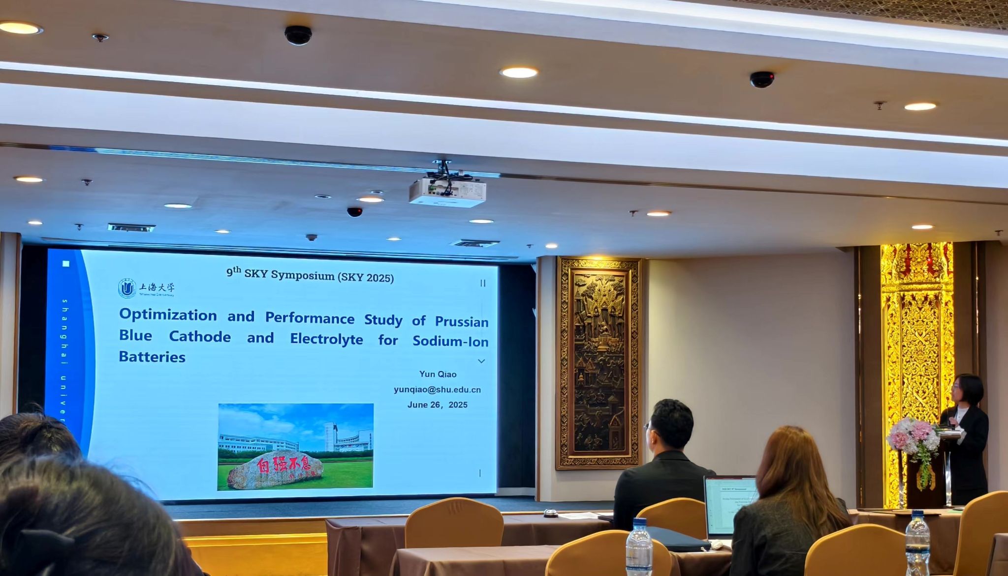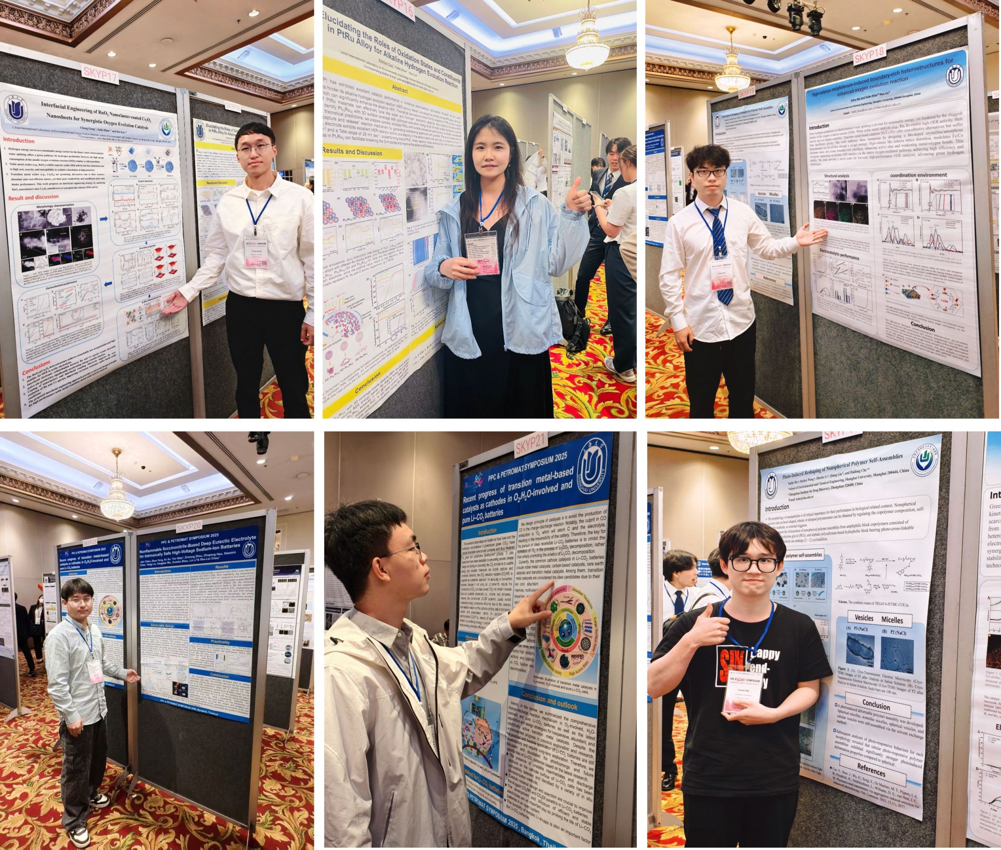 除了教师的精彩报告,本次会议还特别设置了学生展示环节。来自我院的公成、曹贤君、吴金虎、陈建、代宝家和马宇哲等六名师生代表围绕RuO₂纳米簇包覆Co₃O₄纳米片的界面工程、贵金属PtRu纳米材料、钼诱导的富边界异质结构析氧反应催化剂、过渡金属基催化剂作为O₂/Н₂O参与和纯Li-CO₂电池阴极研究进展、钠离子电池不可燃丁二腈基深共晶电解质和光交联管状聚合物囊体等研究领域进行了展示。韩国岭南大学的9名学生代表、日本九州大学的5名学生代表、泰国朱拉隆功大学的5名学生代表以及印度尼西亚大学的1名学生代表也分别介绍了各自近期的研究成果。在提问环节,与会师生展开了热烈讨论,将整场研讨会的学术氛围推向了高潮。