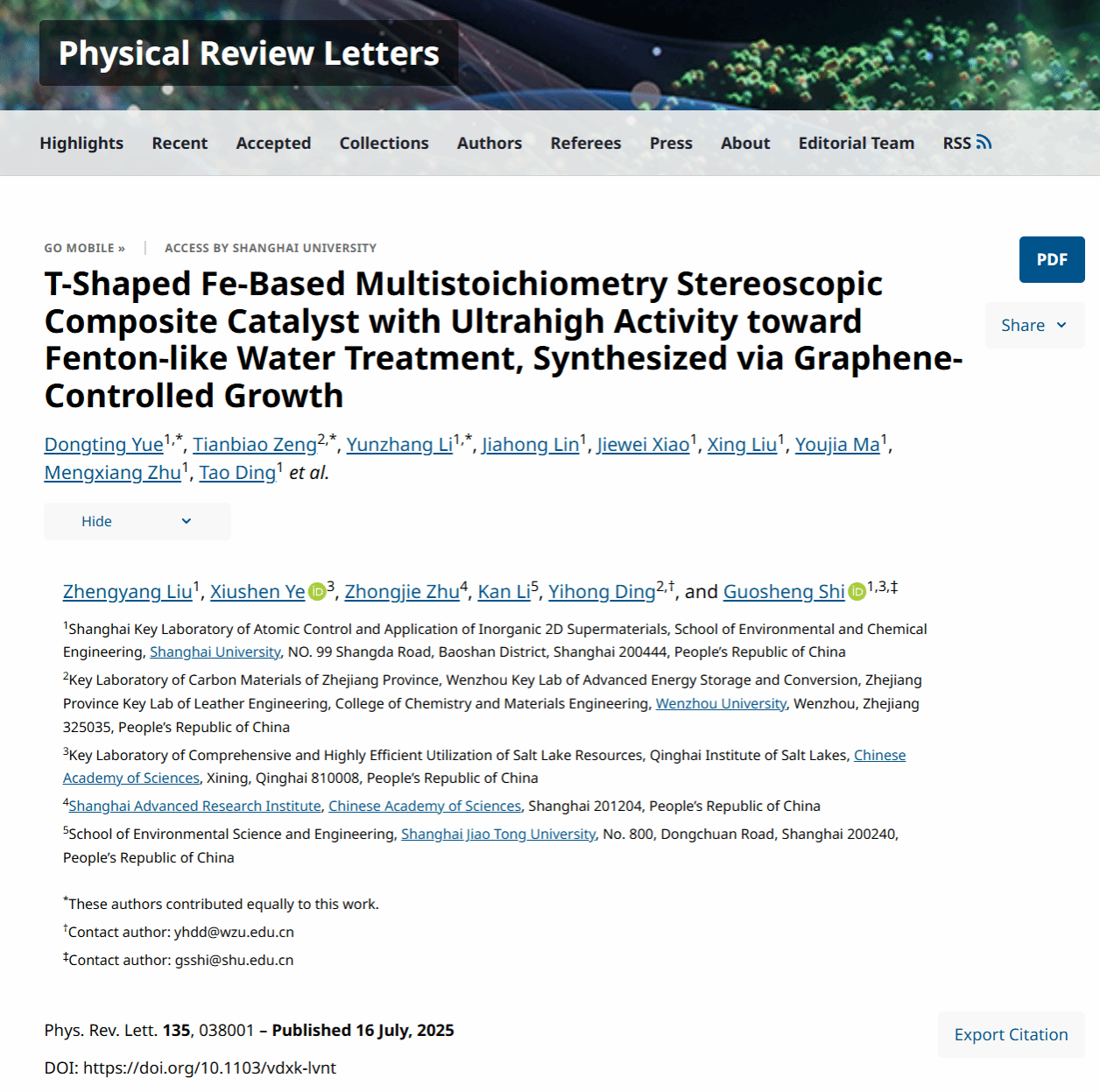 近日,我院石国升研究员团队在国际顶级物理期刊《Physical Review Letters》上发表石墨烯固相调控构筑T型铁基反常多化学计量比(简称:“反晶”)类芬顿复合超高活性催化剂用于有机废水高效处理的研究成果,论文题目为“T-shaped Fe-based multi-stoichiometry stereoscopic composite catalyst with ultrahigh activity towards Fenton-like water treatment, synthesized via graphene-controlled growth”。