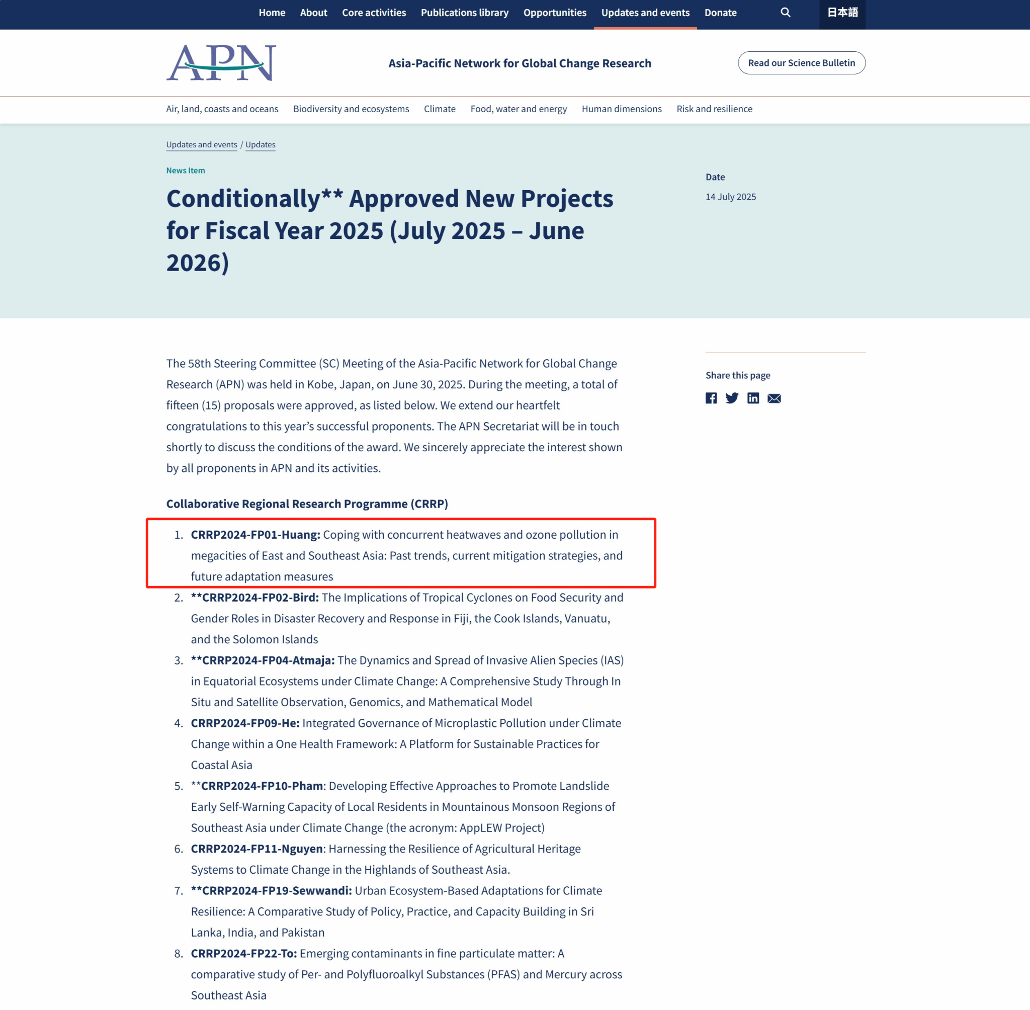 近日,由我院大气污染控制团队黄凌副研究员牵头,联合上海市疾控中心、马来西亚国立大学、马来西亚诺丁汉大学、泰国国王科技大学、韩国高丽大学、日本九州大学及美国Ramboll的学者,在前期合作基础上提出的“应对东亚与东南亚超大城市热浪与臭氧污染:历史趋势、缓解策略与未来适应措施”项目正式获得亚太全球变化研究网络(Asian Pacific Network for Global Change Research,简称APN)2025年协作区域研究计划(Collaborative Regional Research Programme, CRRP)资助。