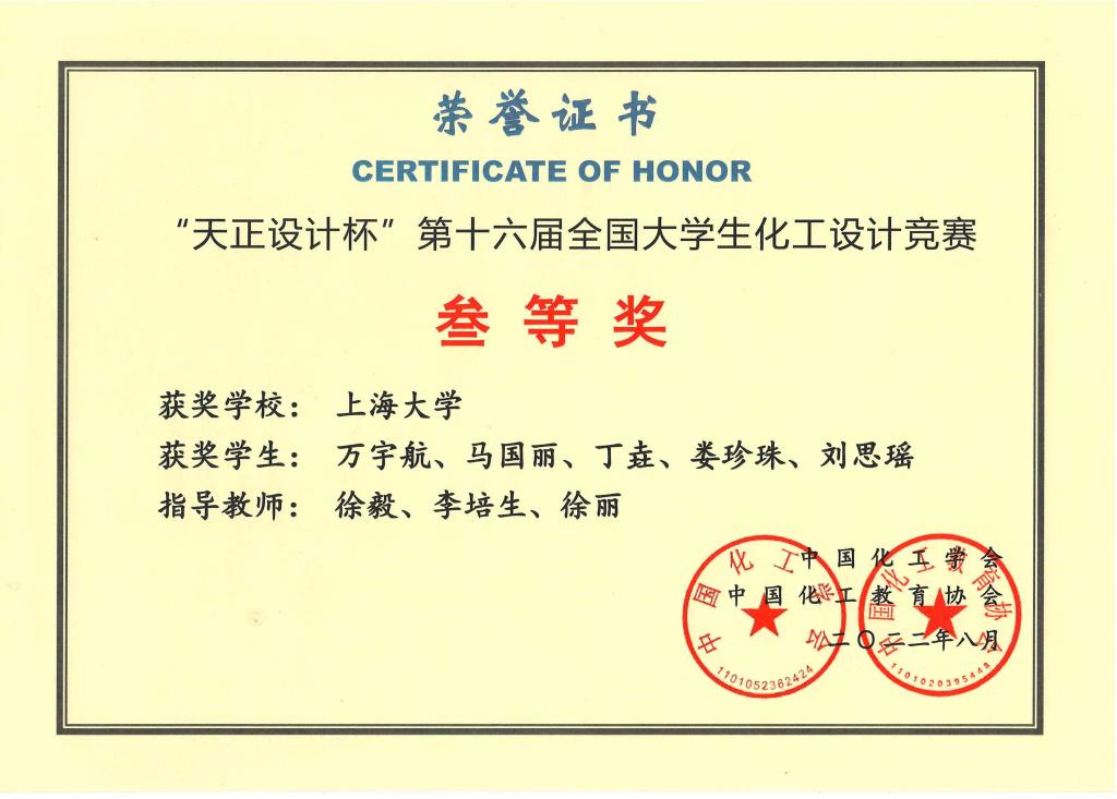 万宇航等同学荣获第十六届全国大学生化工设计竞赛三等奖