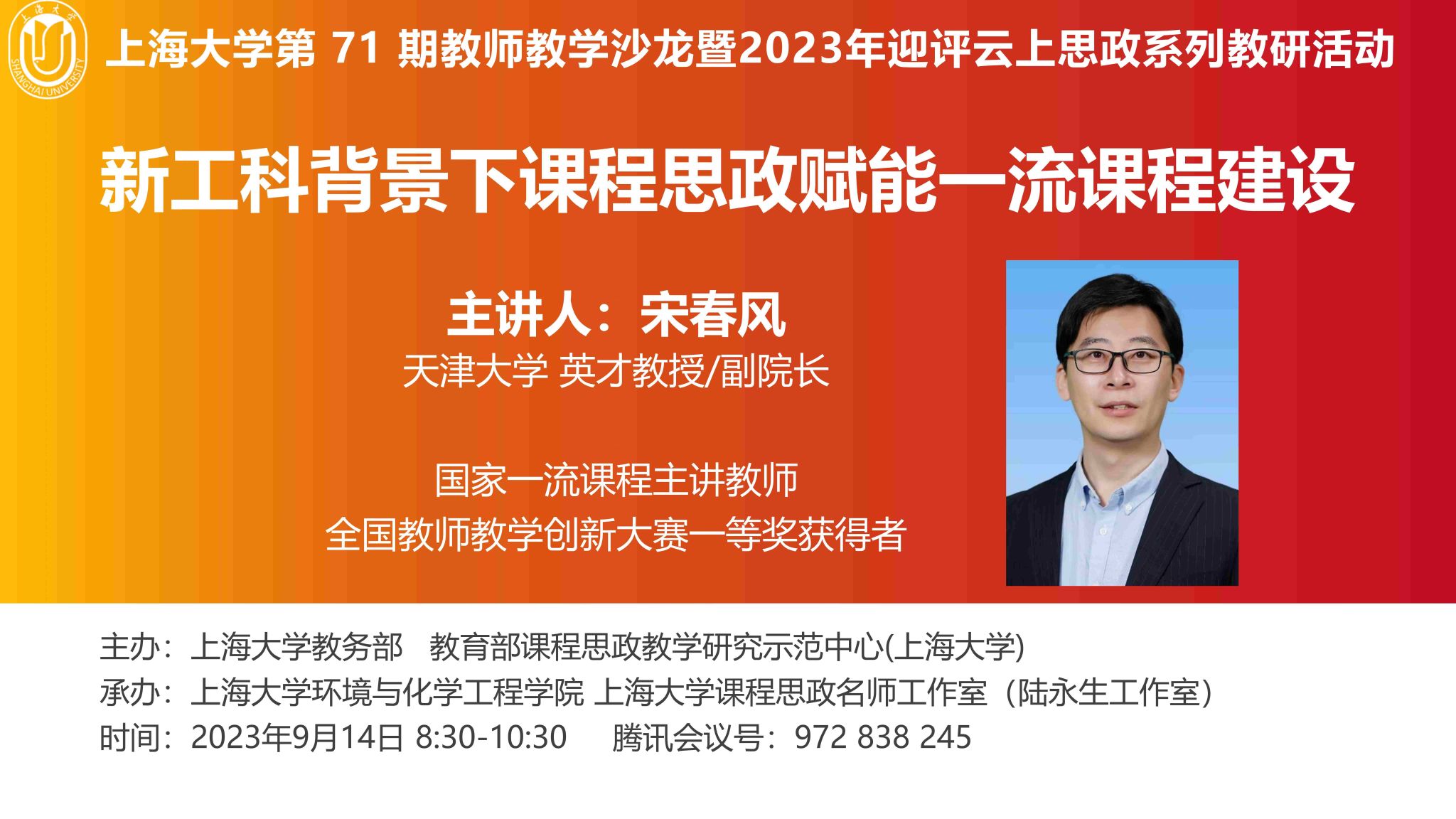 会议首先邀请天津大学环境科学与工程学院英才副院长宋春风教授作题为“新工科背景下课程思政赋能一流课程建设”的线上讲座。教务部副部长、教育部课程思政教学研究示范中心(365英国上市公司)负责人顾晓英教授主持会议。宋春风教授主讲“大气污染控制”等相关课程,曾获全国教师教学创新大赛一等奖,担任有国家首批一流本科课程主讲教师、天津市首批创新创业特色示范课程负责人等,具有丰厚的课程建设经验和方法。讲座中,宋教授从思政融入育人目标、专业发展、课程建设、学生成长四个维度,阐述了自己对于课程思政本质的认识。他简要分析了塑造高等教育未来的六大方向、三大关键词与中国高等教育改革的五大创新内容,并重点分享了“大气污染控制”课程中用“三经五纬”立体式的教学创新来开展新工科改革与课程思政建设的具体实践。宋教授讲座受到教师广泛好评,激励学院教师努力建好课、讲好课、育好人,进一步深化教育教学改革探索,以实际行动和饱满精神迎接本科教育教学审核评估。