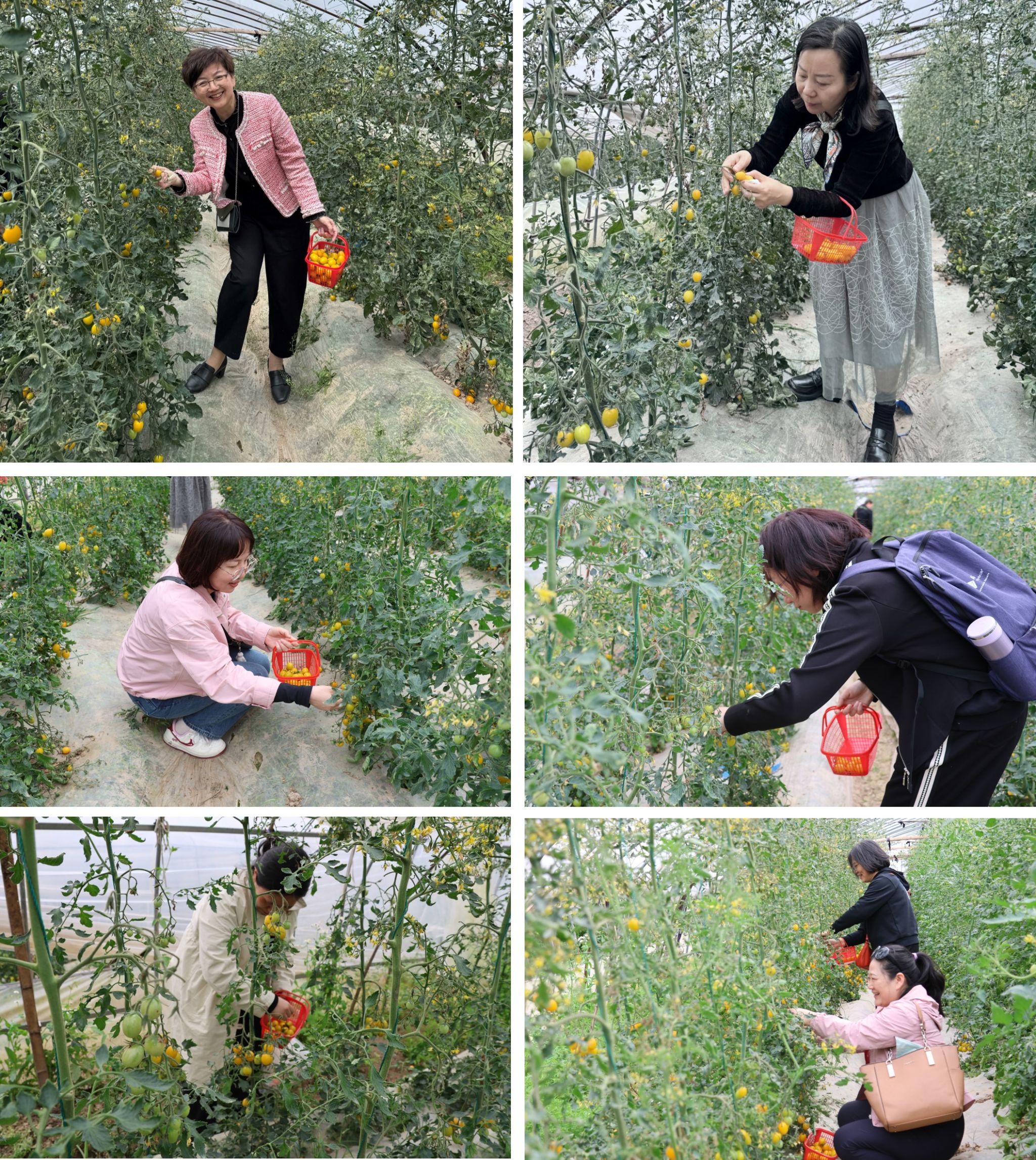 在参观生态农业和劳动实践环节,老师们手提篮子,在圣女果大棚里尽情感受着采摘的乐趣。不同颜色的圣女果在绿叶映衬下,勾勒出一个生机盎然的春天。大棚里欢声笑语不断,老师们互相交流着采摘经验,品尝着劳动成果,沉浸在收获的喜悦之中。
