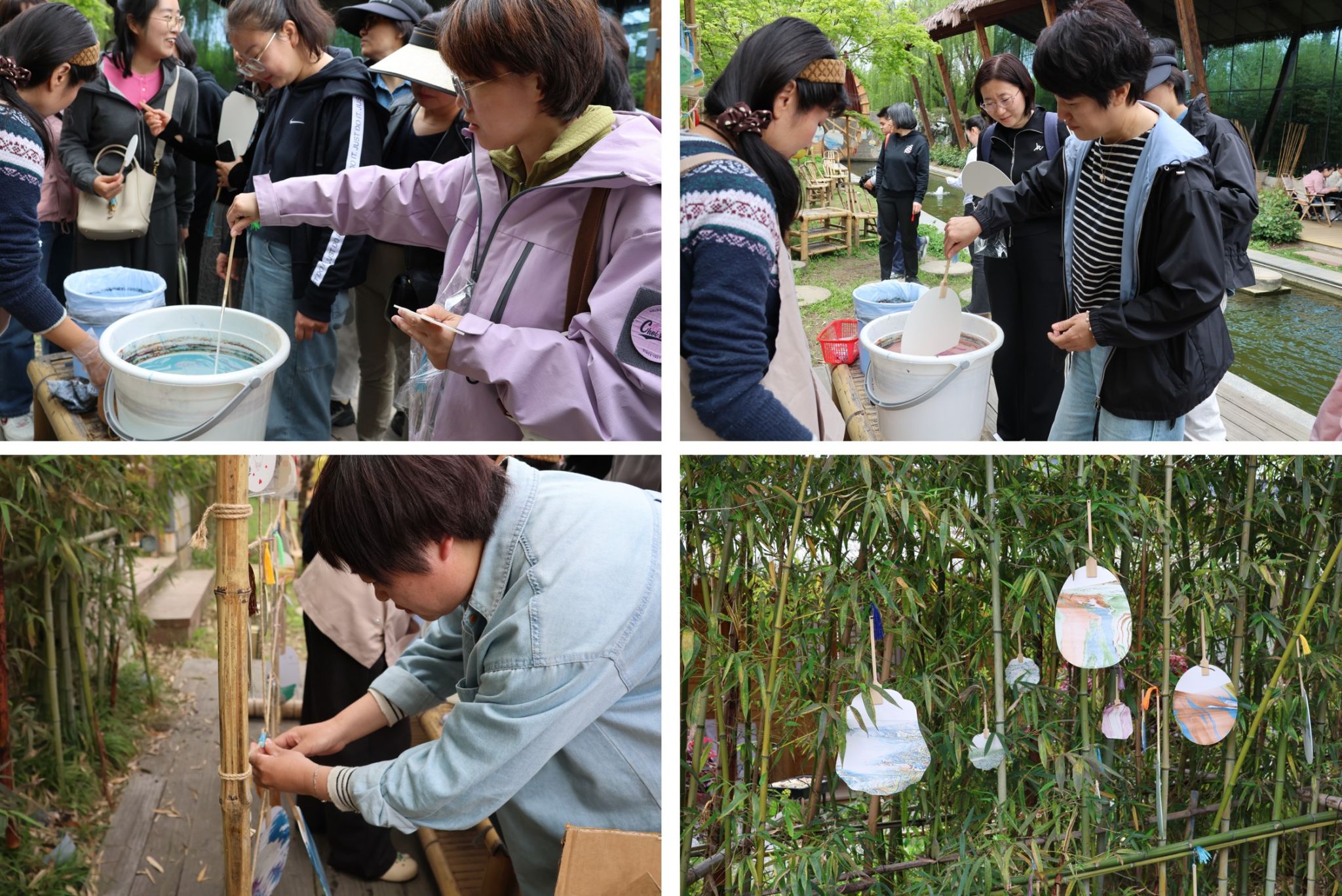 本次愚弄庄园参观活动分为手工制作和劳动实践两部分。在手工制作环节,经由工作人员的指导,老师们了解了漆扇制作中配色、构图、上色的技巧,制作出一把把精美绝伦、融入了意境美、诗意美的漆扇。春风中,一把把漆扇随风摇曳,与青翠的枫叶、竹叶相映成趣,散发出中华文化的独特魅力。