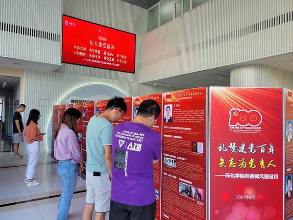 2021年9月,环化学院将党史学习教育与师德师风建设工作紧密结合,以“礼赞建党百年,矢志为党育人”为主题,开展“师德师风建设月”系列宣传与教育活动,大力宣传和弘扬优秀教师、教师世家的先进事迹和高尚品德,为建党百年华诞献礼。