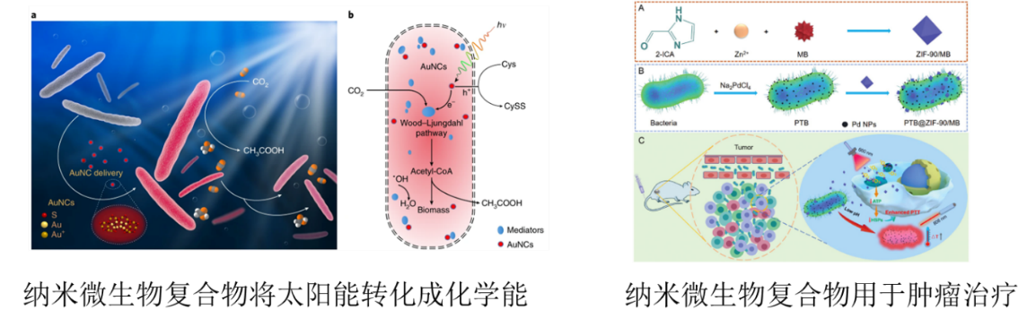 纳米材料和微生物细胞结合可以构建无机物-有机体复合结构,该复合体具备了生物体的生命特征,又同时被赋予了纳米材料拥有的光学、电学、磁学等方面的性质。被纳米材料改造后的微生物在化学品制造、新材料构建、抗癌治疗、环境治理等多个领域展现出巨大的潜力。